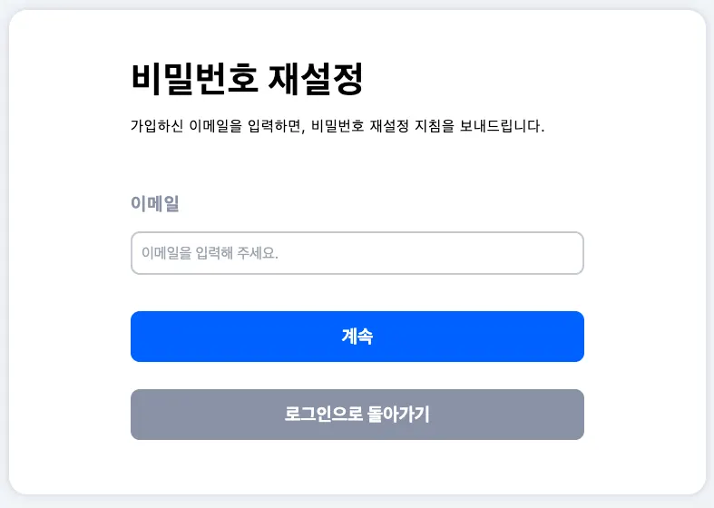 비밀번호 재설정 페이지에서, 비밀번호를 변경하고 싶은 메일의 주소를 입력 후 계속 버튼을 눌러주세요. 그러면 비밀번호 재설정 메일이 입력하신 주소로 전송돼요.