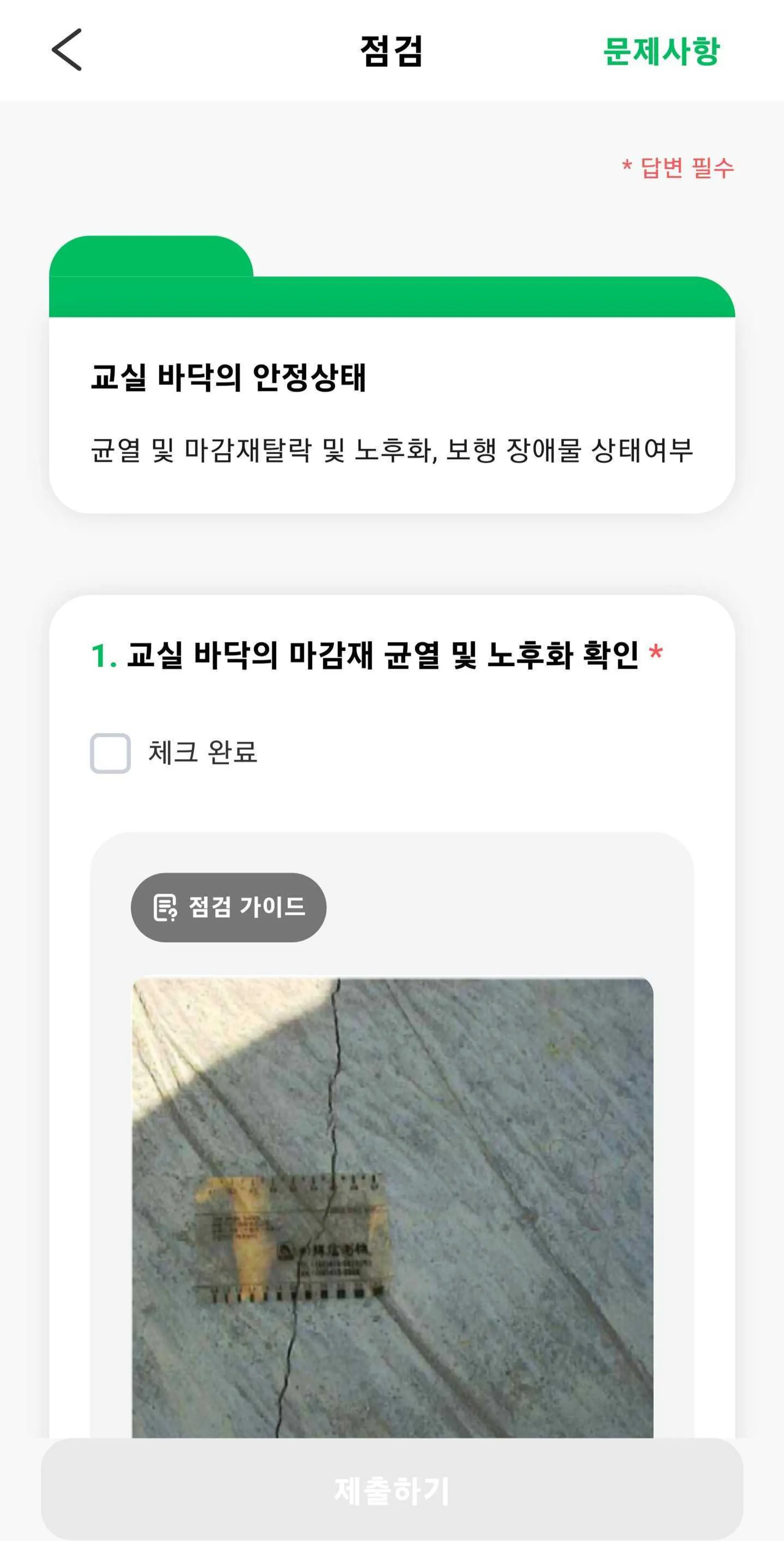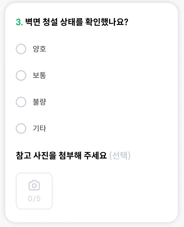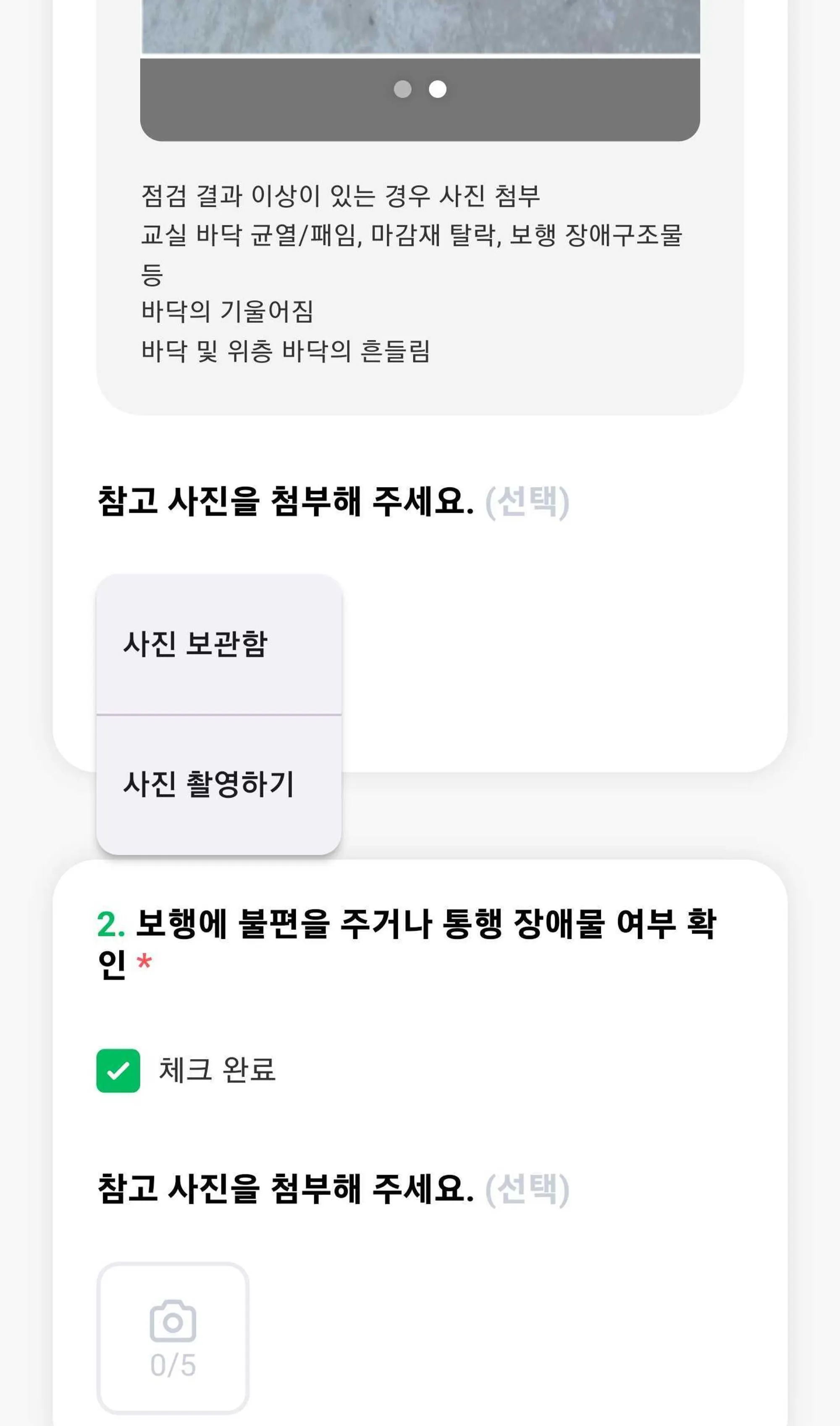 점검 중 관리자가 설정한 문항에 사진을 업로드 할 수 있어요. 사진이 필요한 경우 이용해 보세요.