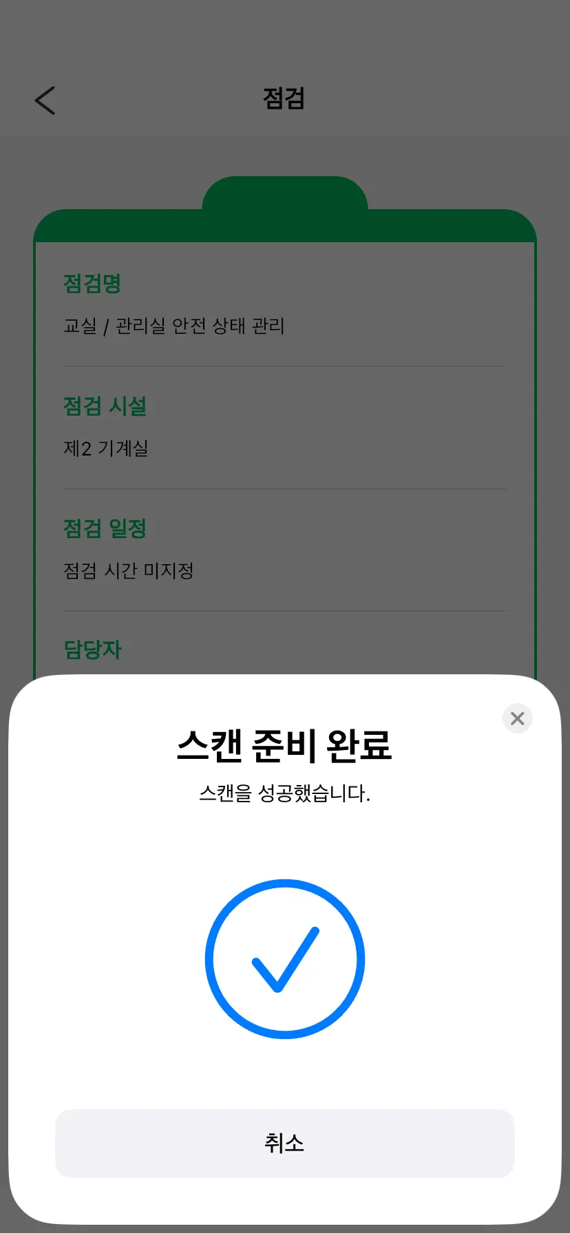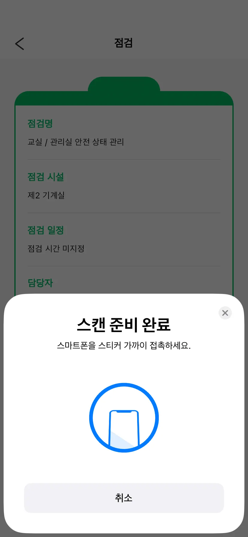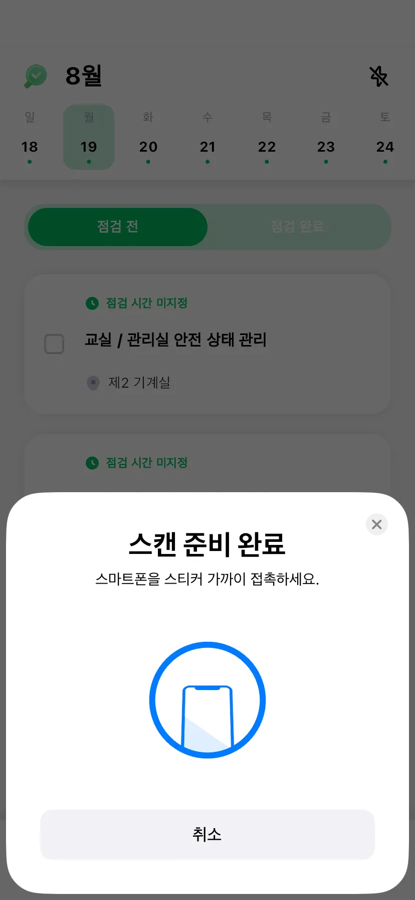 “스캔하기”를 실행하고 NFC스티커에 스마트폰을 가까이 접촉해 주세요. 스캔이 완료되면 점검을 시작할 수 있어요.