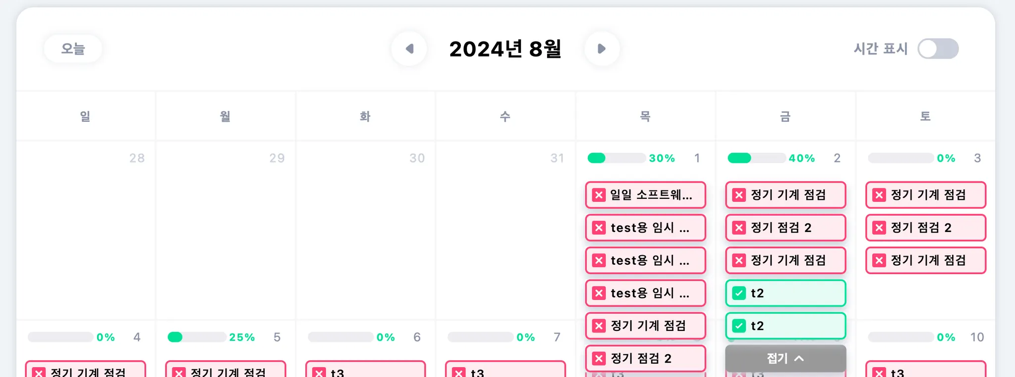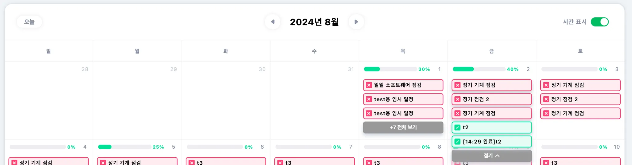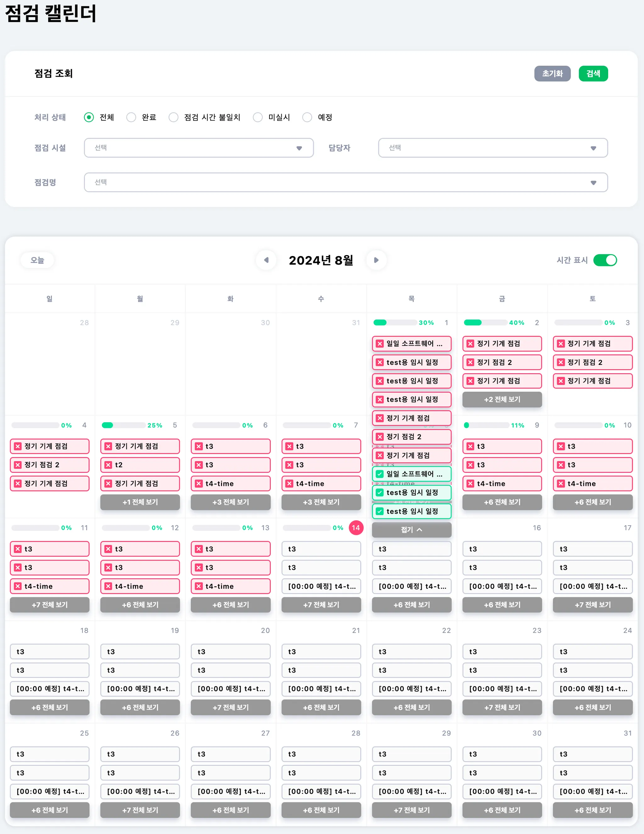 점검 캘린더는 등록된 전체 점검 일정을 쉽게 파악하기 위한 기능이에요. 점검을 올바른 시간에 진행했는지, 어떤 점검이 예정되어 있는지 관리자가 쉽게 볼 수 있어요.
