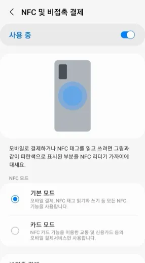 ( 삼성 제조사의 경우, NFC 활성화에 더해 “기본 모드”까지 꼭 활성화 해주셔야 해요. )