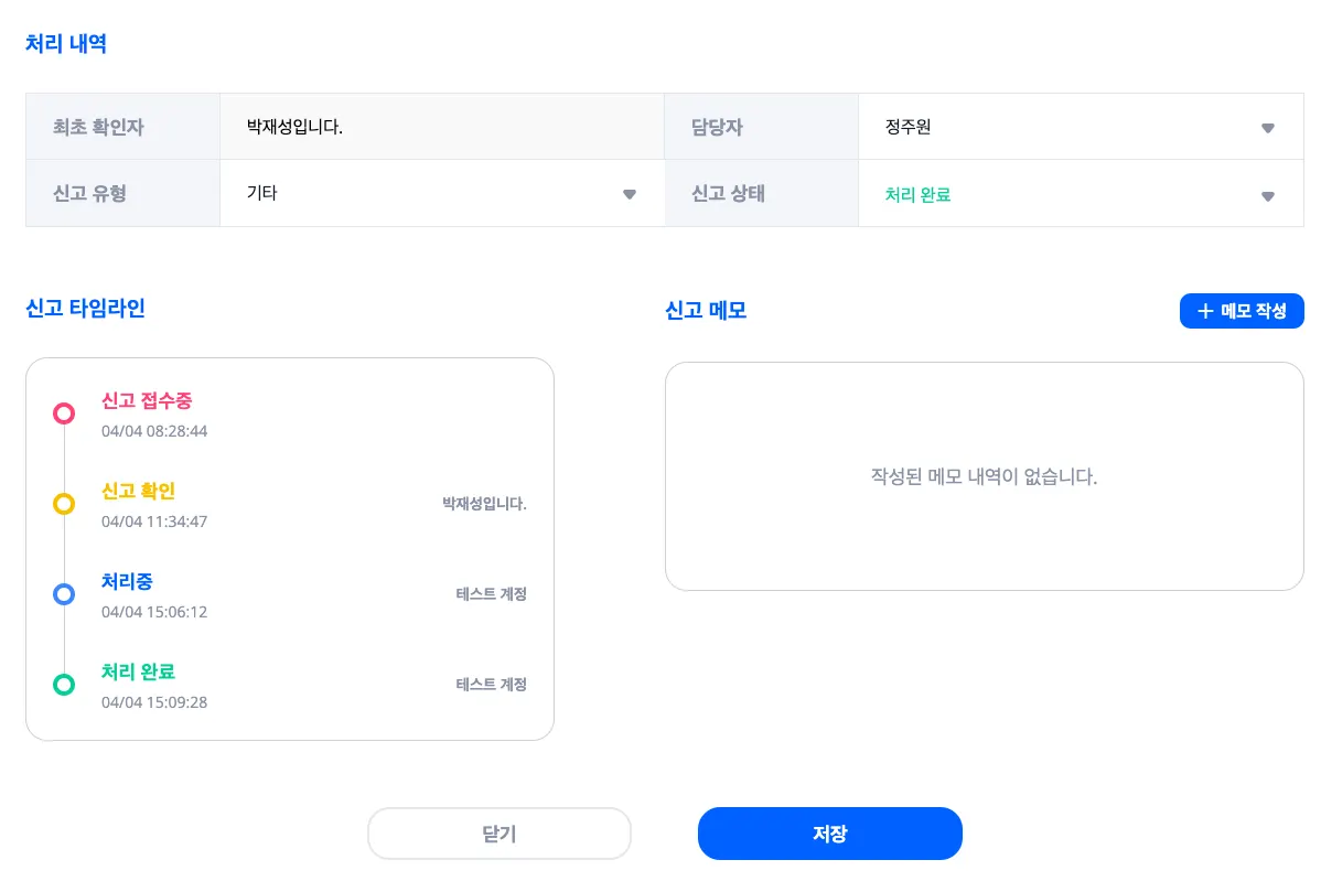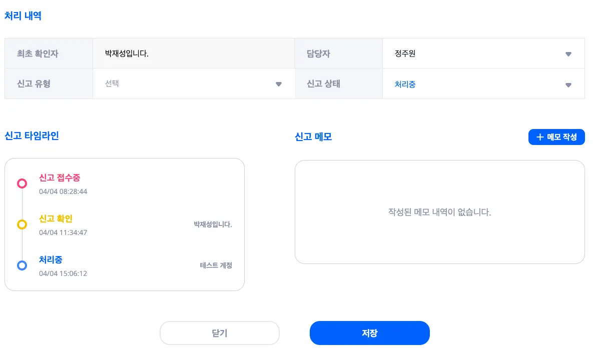 담당자를 선택한 후 신고 처리를 시작하면, 신고 상태를 “처리중”으로 바꾸고 저장 버튼을 눌러주시면 신고 상태가 변경돼요. 누군가 들어온 신고에 대해 대응을 시작했다는 의미예요.