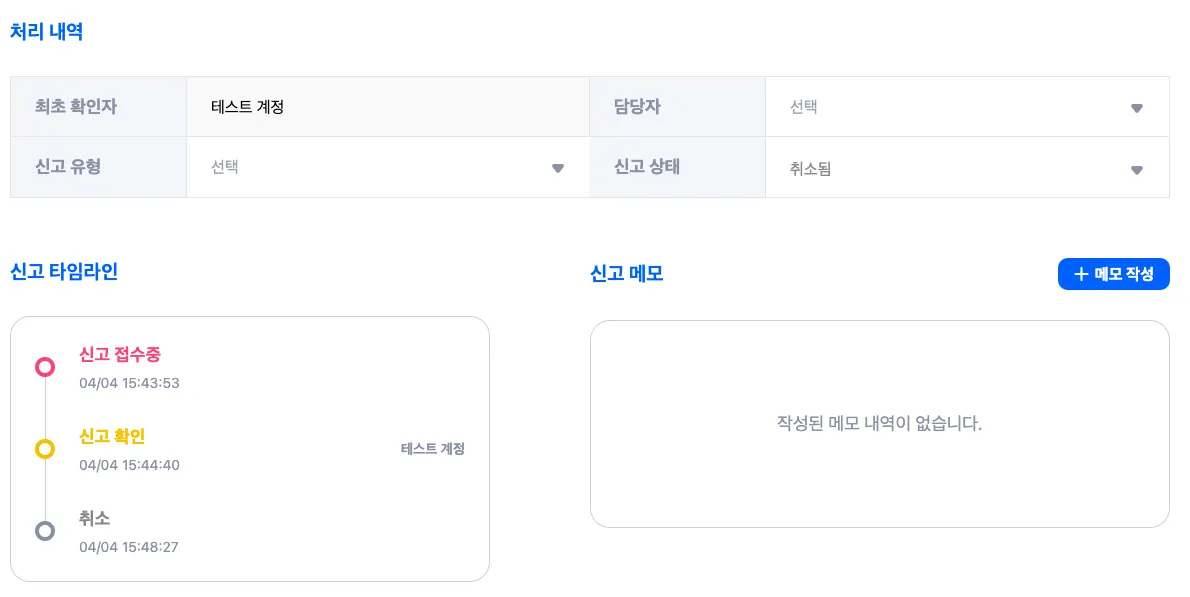 중요) “처리 완료” 상태가 아닌 신고 건들은 아직 미처리 상태로, 대시보드의 신고 처리율 등에 반영되지 않을 수 있으니 종료된 신고는 꼭 “처리 완료” 상태로 변경해 주세요.