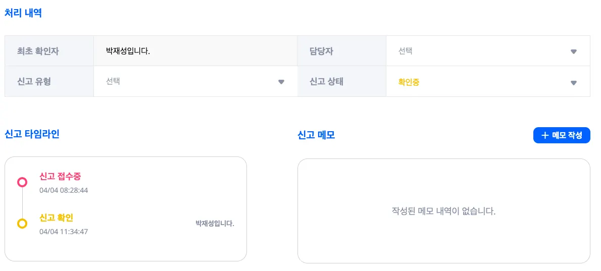 누군가가 “신고 접수중”인 신고 건을 눌러 자세한 정보를 확인하게 되면, 그 즉시 신고 건이 “확인중” 상태로 변경돼요. 누군가가 들어온 신고에 대해 확인했다는 의미예요. 최초로 확인한 사람은 자동으로 최초 확인자에 등록돼요. 이제 신고 처리를 위해 담당자를 설정하고 신고 상태를 “처리중”으로 변경할 수 있어요.
