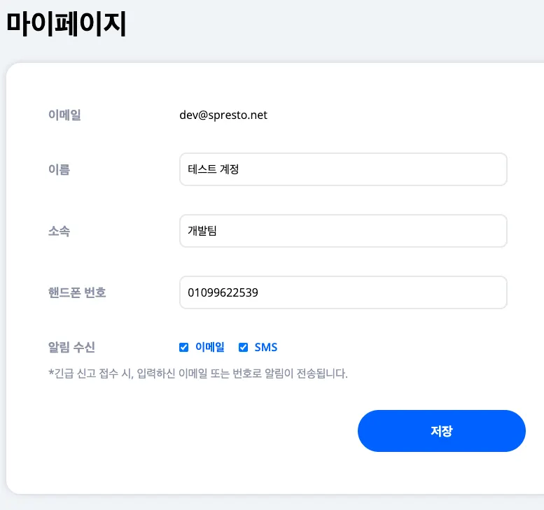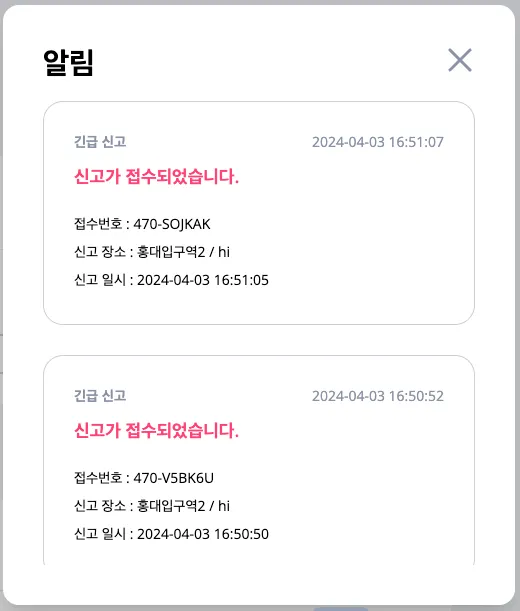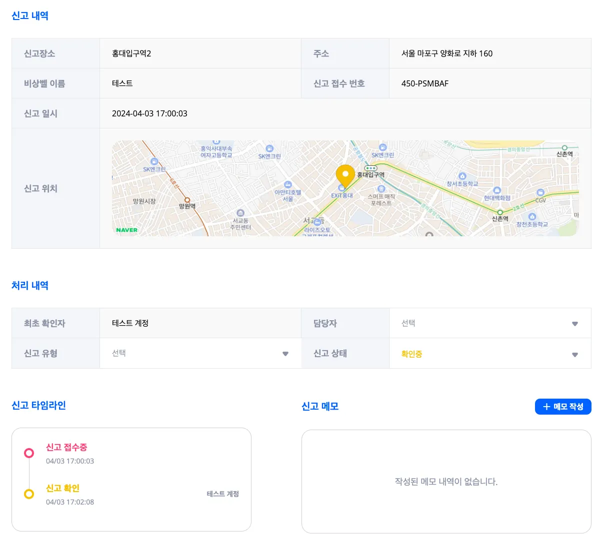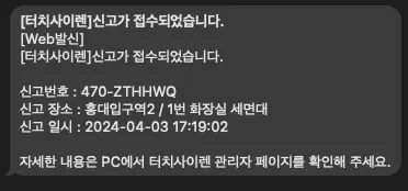 신고가 접수될 경우, 자동으로 관리자들에게 문자 메시지로 신고 접수 사실이 전달돼요. 문자에 적힌 신고 장소로 바로 갈 수도 있고, 더 정확한 확인을 위해 PC에서 정보를 확인할 수도 있어요.