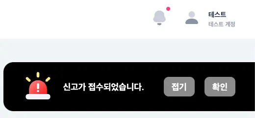 신고가 들어오는 즉시 아틀라스 화면 우상단에 신고 접수 알림이 도착해요. 해당 알림을 클릭하면 신고에 대한 자세한 정보를 확인할 수 있어요.