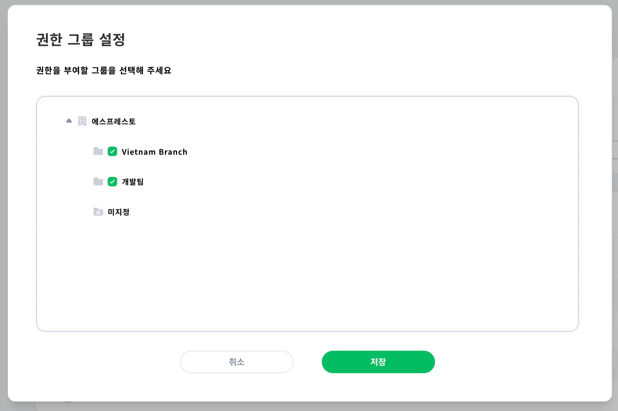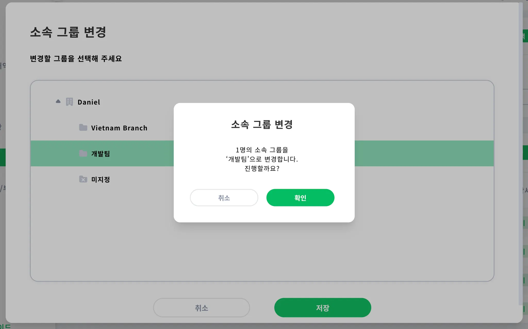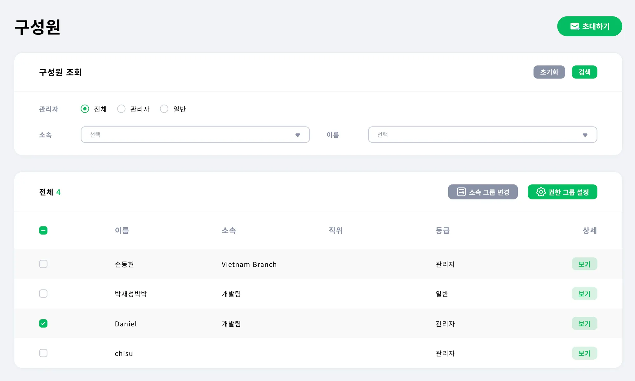 조직 > 구성원 목록 화면에서 구성원들의 소속 그룹을 변경하거나, 권한 그룹을 설정할 수 있어요.