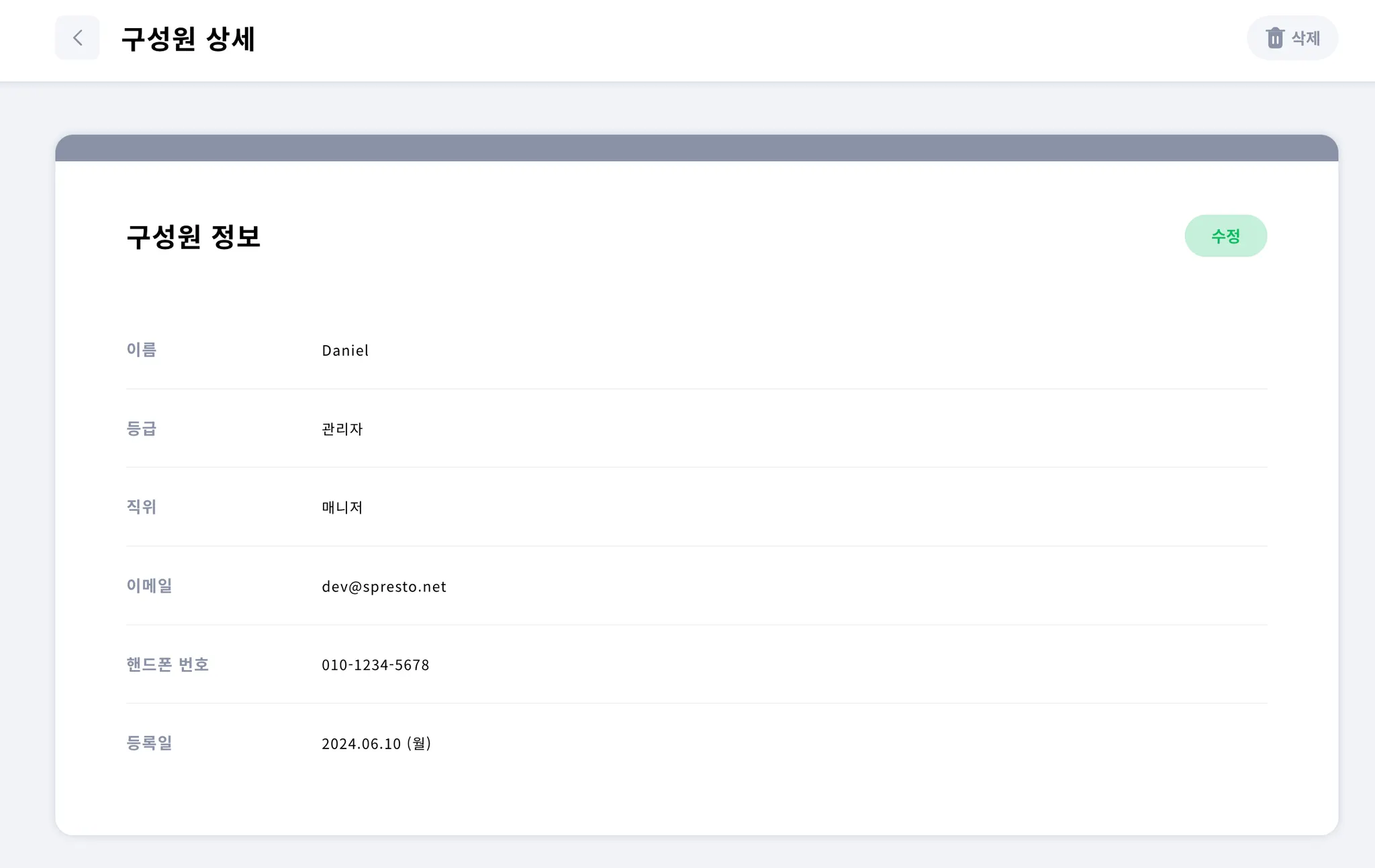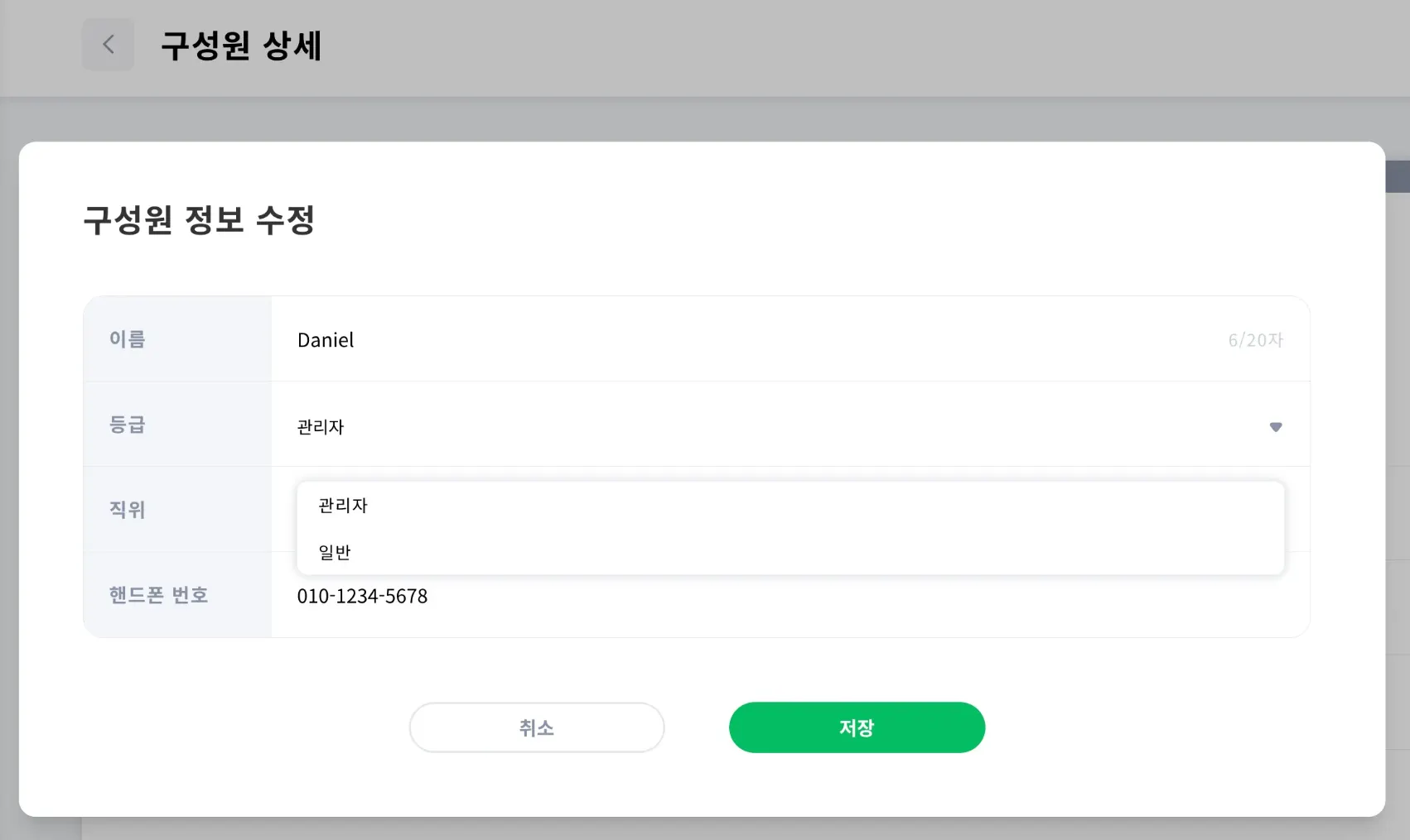 조직 > 구성원 > 구성원 상세 화면에서 우측 상단의 [수정] 버튼을 누르면 등급을 변경할 수 있어요. 만약 관리자 등급의 구성원을 일반 등급으로 변경할 경우, 해당 구성원은 다시 관리자가 되기 전까지 구성원 초대 및 변경, 삭제를 할 수 없으니 주의해 주세요.