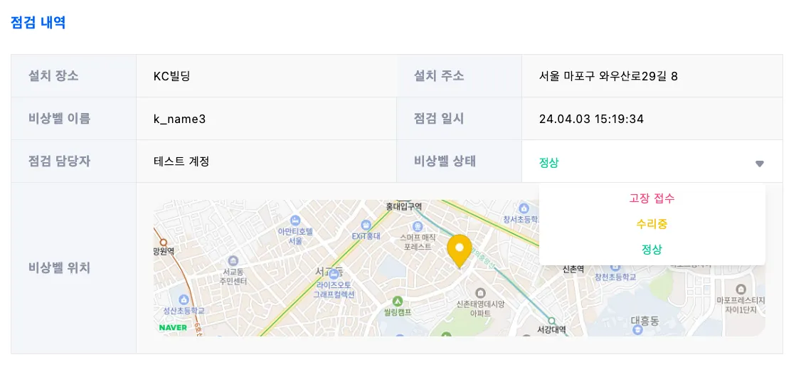 다만 비상벨이 고장 혹은 훼손되어 점검 결과가 “고장접수” 로 점검이 등록될 경우, 비상벨 상태도 똑같이 “고장접수”로 변하게 돼요. 이 비상벨의 상태를 다시 정상으로 돌리기 위해 점검 상태 수정이 필요해요.