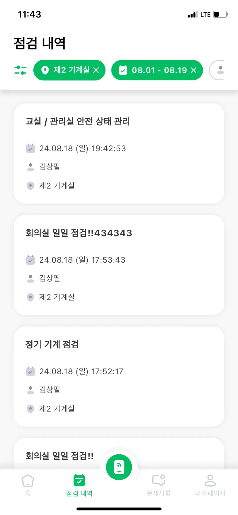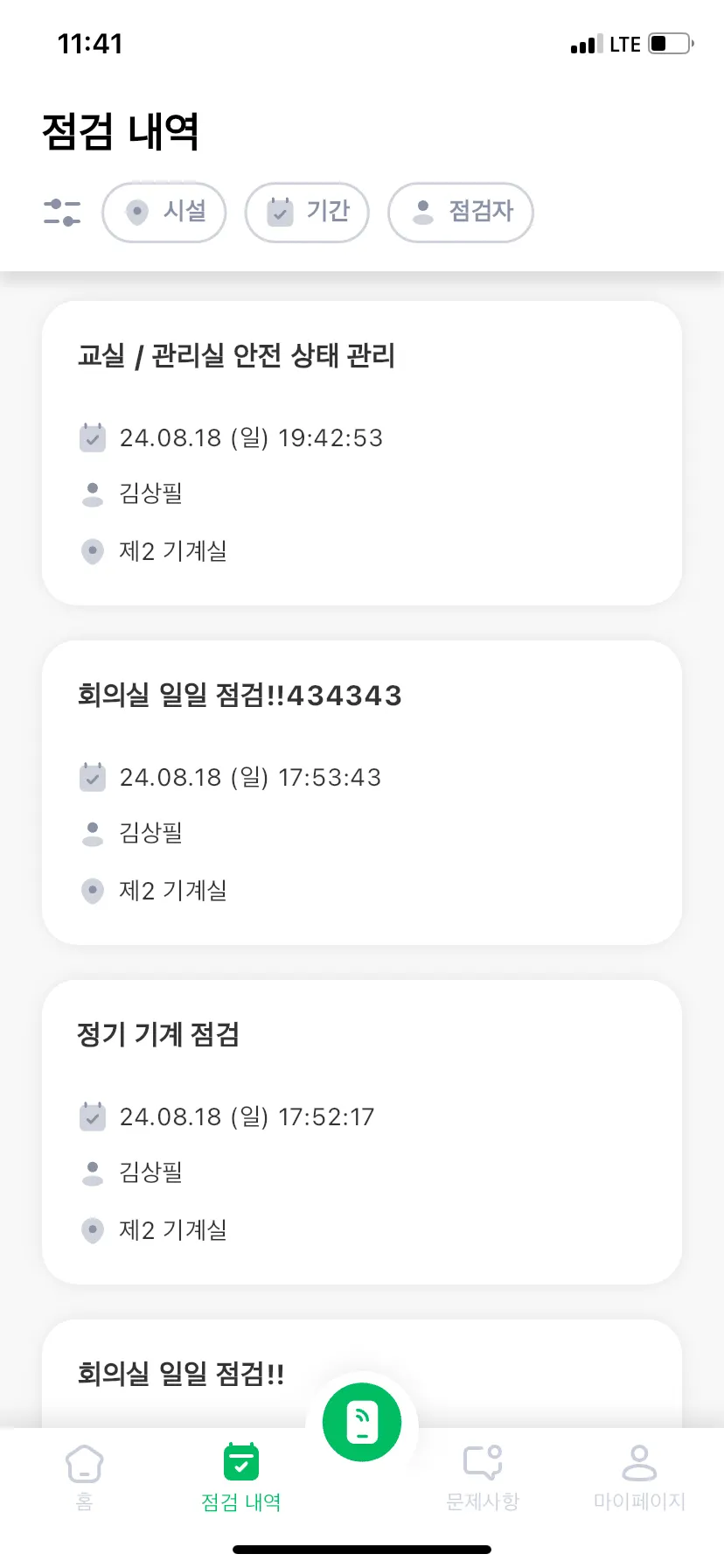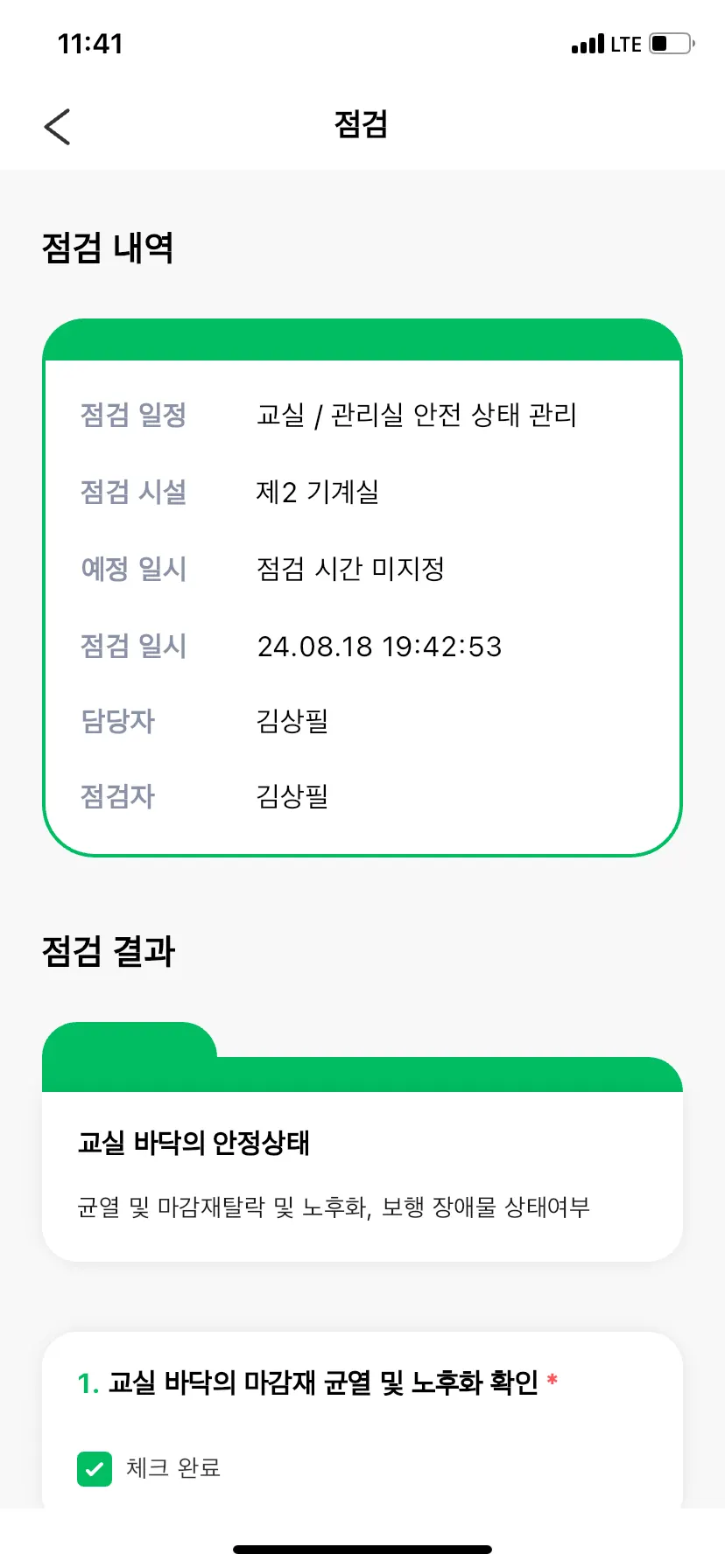 점검 내역에는 점검 일시 및 담당자, 점검 결과를 확인할 수 있어요.