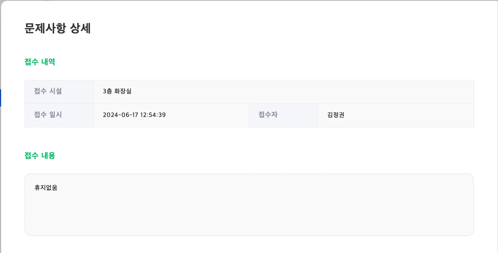 문제사항은 담당자가 시설을 점검하는 도중 특이사항에 대한 보고를 위해 사용하는 기능이에요. 담당자 전용 어플리케이션에서 문제사항을 등록하면 관리자는 관리자 페이지에서 확인이 가능합니다.