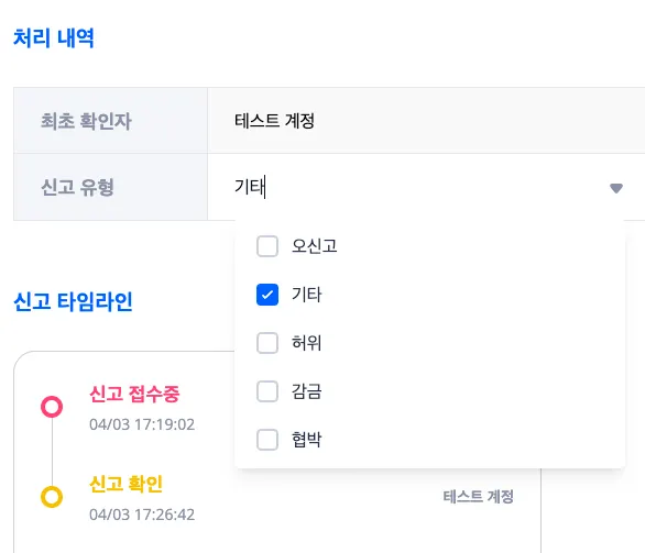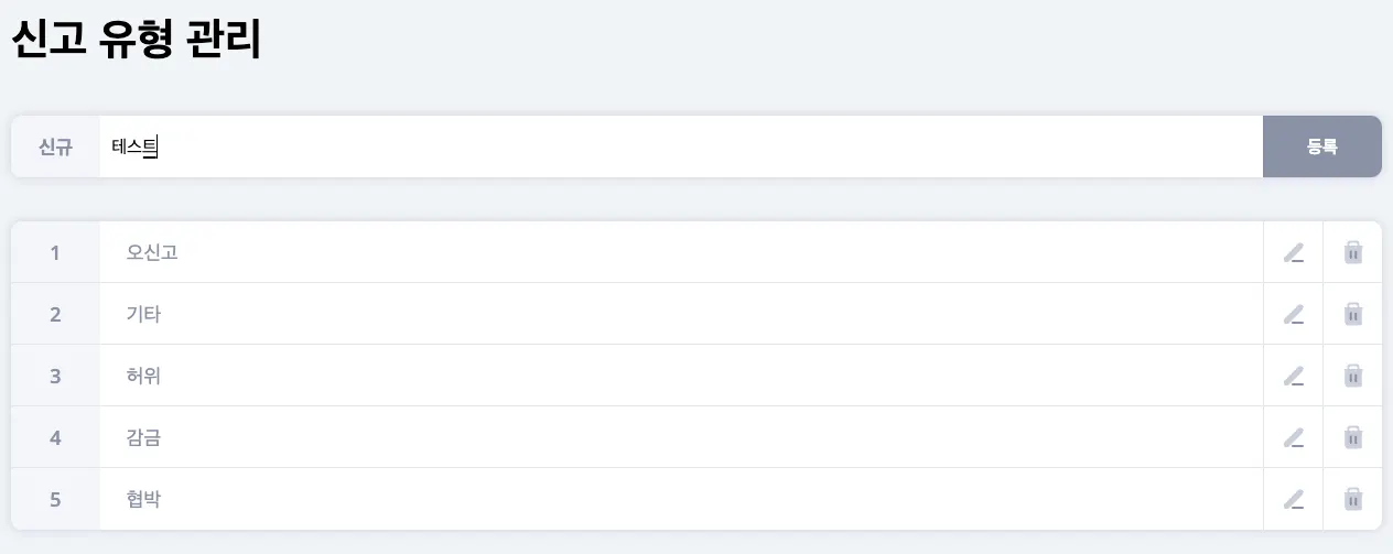 설정 > 신고 유형 관리 페이지에서, “신규” 입력창에 원하는 유형 이름을 입력하고 등록 버튼을 눌러 주시면 신고 유형 등록이 가능해요.