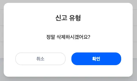 설정 > 신고 유형 관리 페이지에서 삭제를 원하는 유형의 우측, 휴지통 버튼을 눌러주세요. 그리고 아래처럼 나오는 팝업에서 확인 버튼을 누르면 유형 삭제가 완료됩니다.