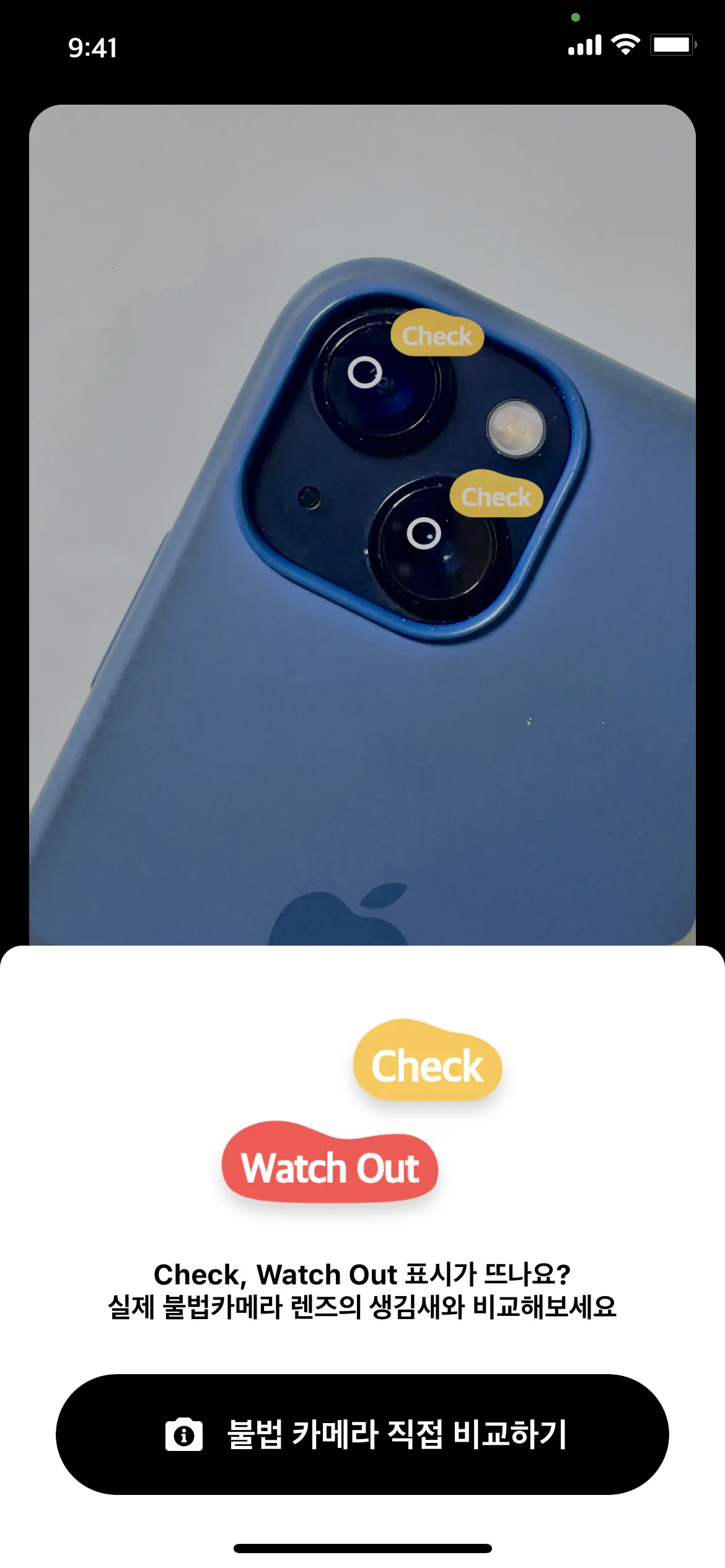 AI 탐지 모드에서 지속적으로 check 표시가 나오는 경우, 실제 카메라 렌즈인지 확인이 꼭 필요해요. 실제로 있는지 반드시 육안으로 확인해보시고, 혹시나 불법카메라를 발견하실 경우 바로 경찰에 연락해주세요.