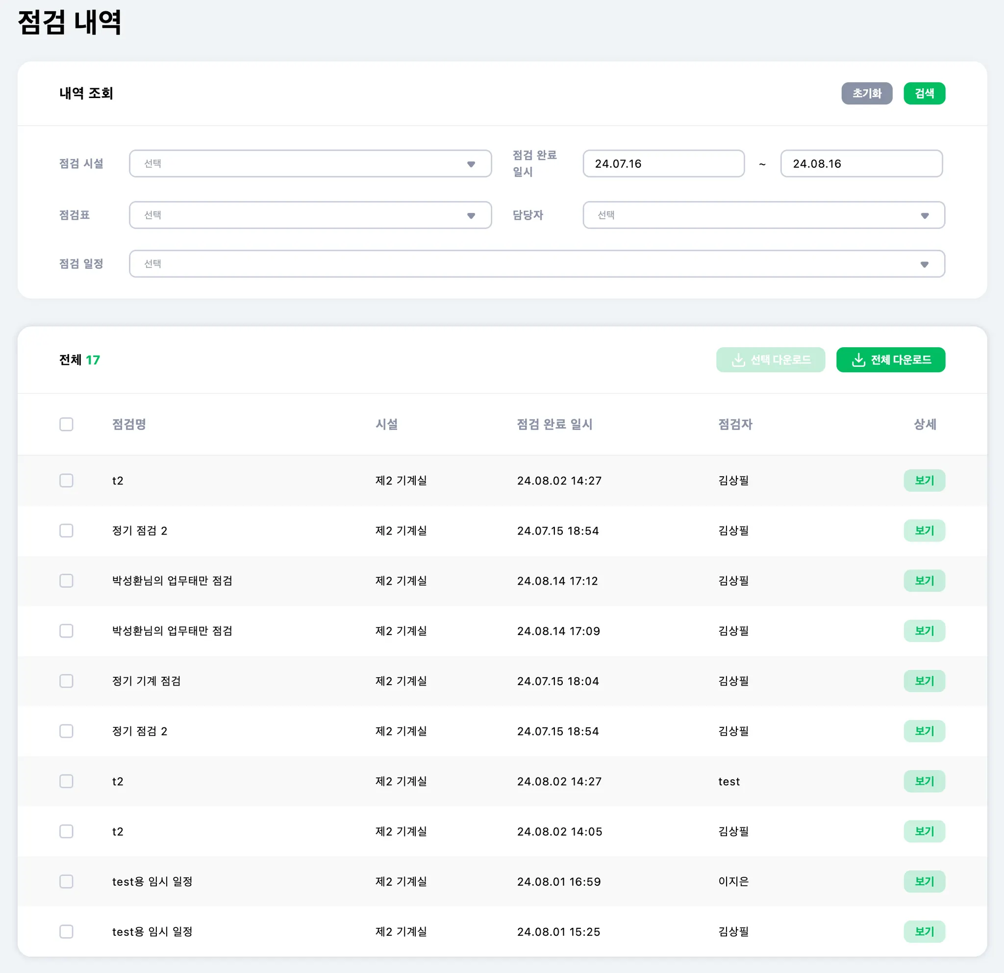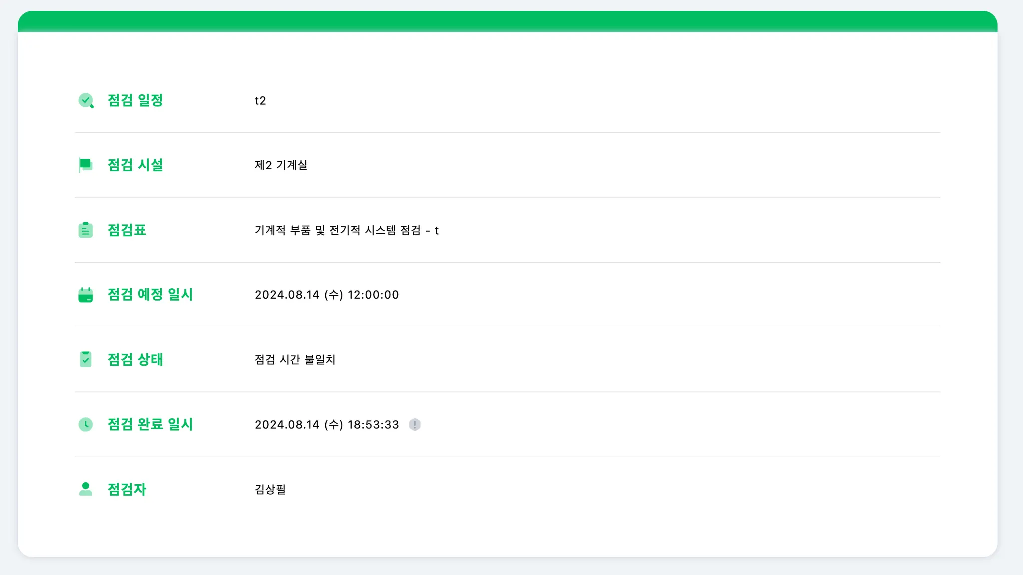 점검 내역은 완료된 점검 일정이에요. 점검자가 언제 점검을 완료 했는지, 올바른 시간에 했는지 담당자가 점검을 진행했는지와 같은 자세한 내용들을 볼 수 있어요.