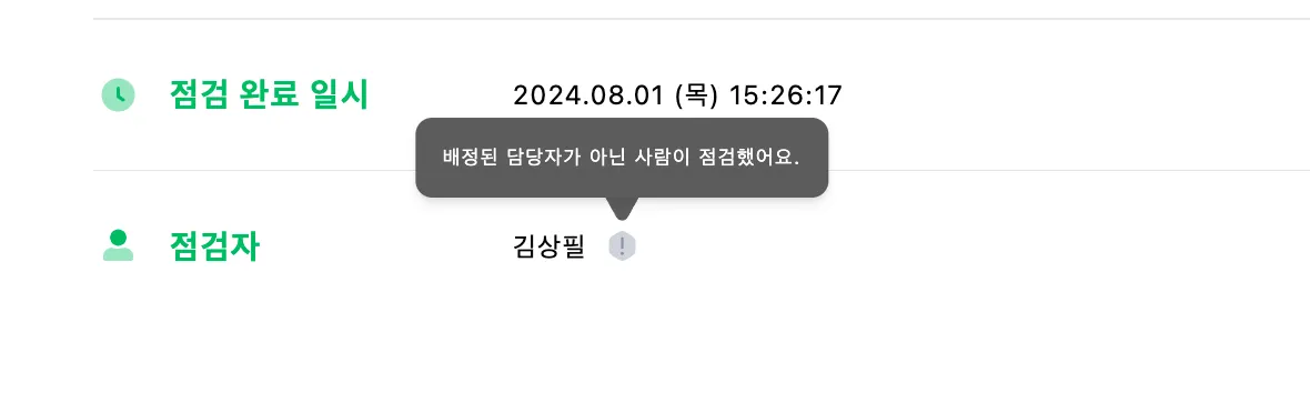 외에도 담당자와 실제 점검을 진행한 자가 다른 경우 알려주고 있어요.